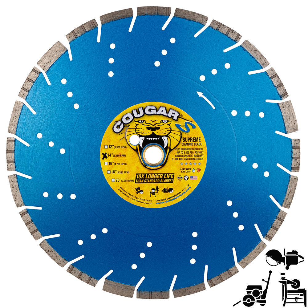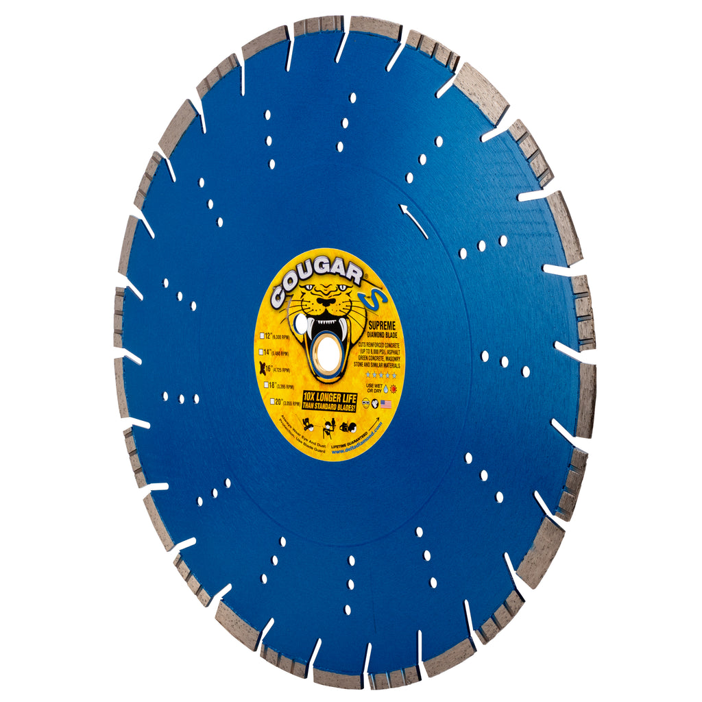 For superior cutting speed, efficiency and a low cost per cut, COUGAR® S Supreme blades are used for wet/dry cutting of reinforced concrete (up to 7,000 psi), reinforced concrete, concrete pipe, green concrete, asphalt, masonry and more! Use with all concrete saws (up to 40 hp), hand-held power saws or masonry saws.