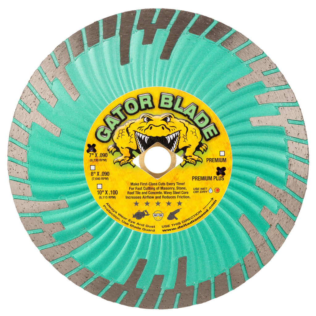 Gator Plus wet/dry diamond blades cut concrete, masonry, stone, roof tile and all similar materials. Manufactured with the highest quality GE Super-abrasive diamonds, they will out-last and out-cut any diamond blade on the market today. Features a wave design, heat-treated steel core that increases airflow, reduces friction and is guaranteed to withstand the demands of dry cutting.