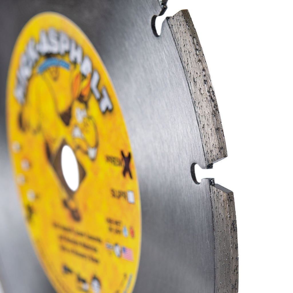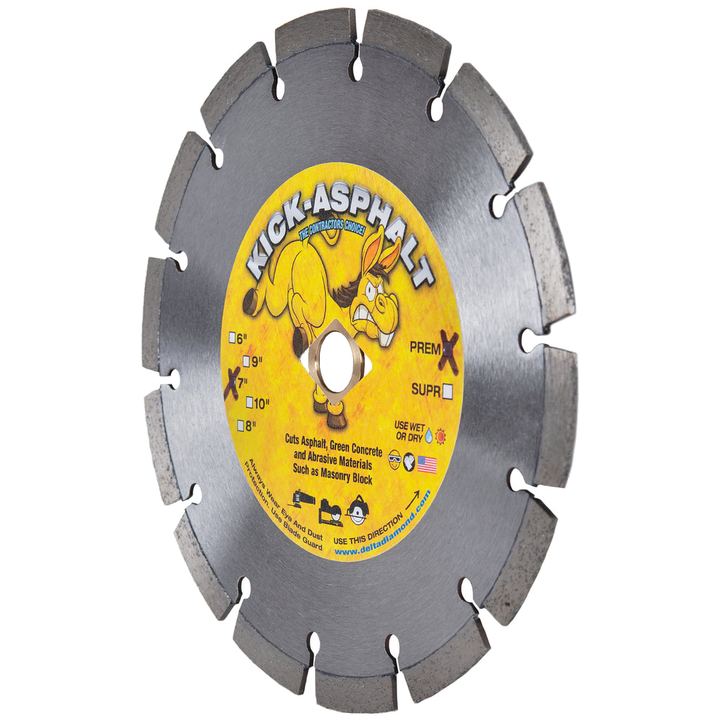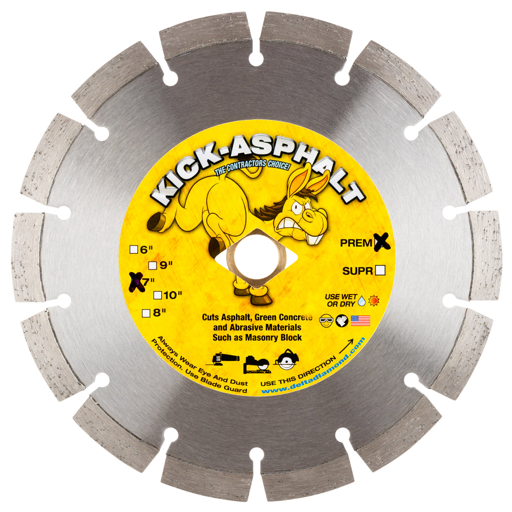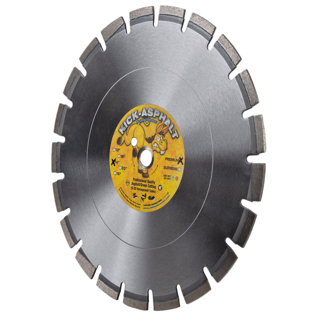 Kick-Asphalt premium diamond saw blades are designed for high-production cutting of asphalt, green concrete, and abrasive block. Engineered with 40% diamond concentration to offer excellent cutting speed and blade life. Can be used on all hand-held gas/electric saws or 5-40 HP concrete saws. Use on all types of asphalt, green concrete and abrasive materials such as block.